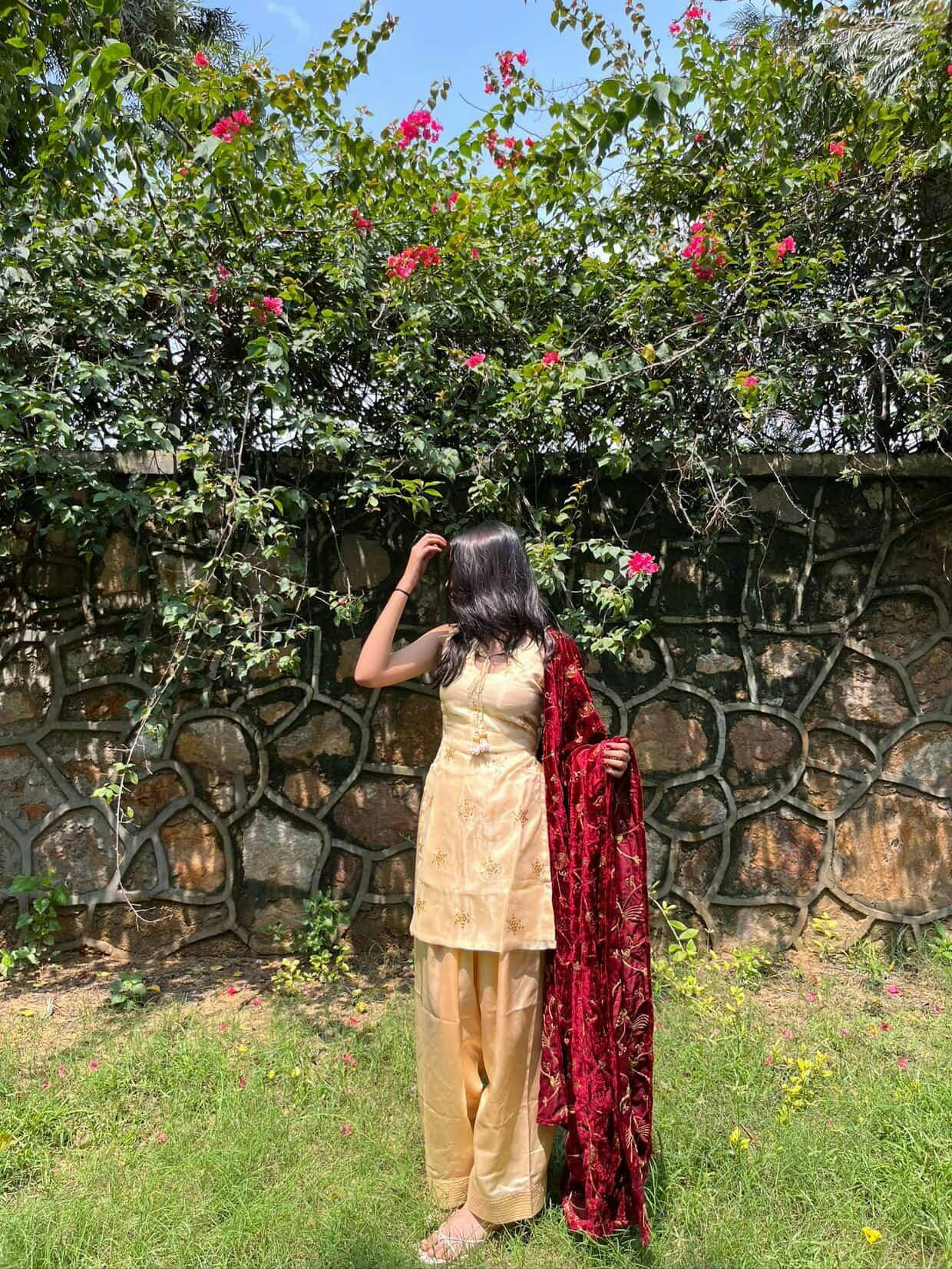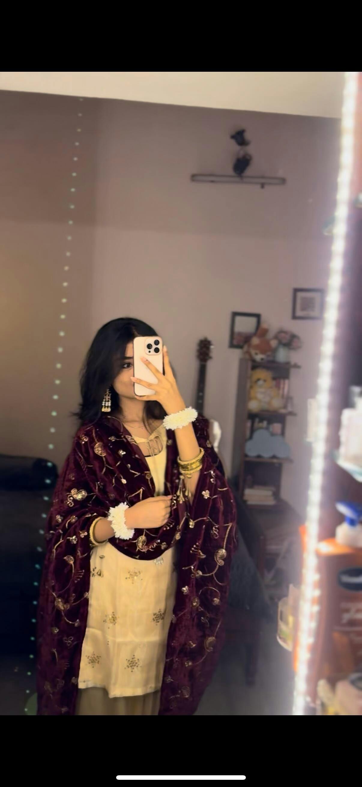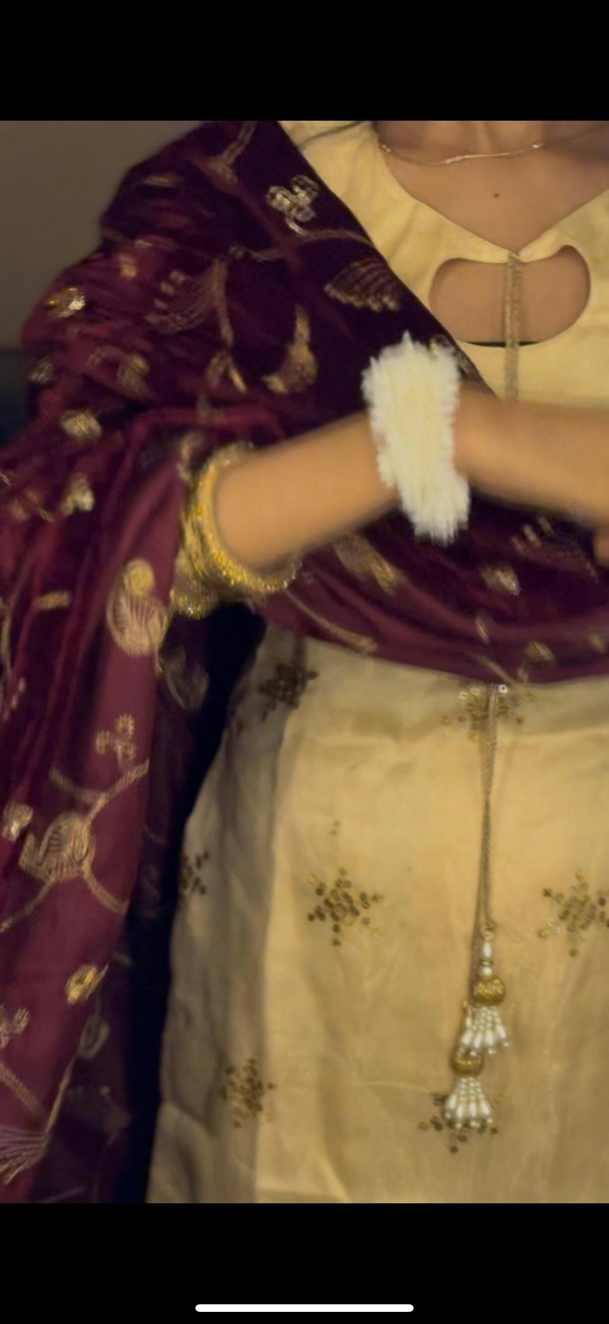 The kurta is made from twill net with satin lining and features a tie-up neckline finished with delicate beaded latkans. It’s paired with a satin Farsi salwar that offers both comfort and structure. The velvet dupatta, fully embroidered in gold, adds depth and texture to the set. The back of the kurta has adjustable straps for a customizable and secure fit.