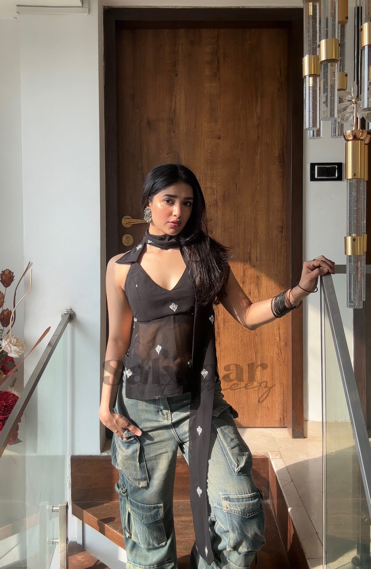 The Bijlee Top is bold, sleek, and effortlessly striking. Made in classic black georgette, it features a clean, structured silhouette with a collar neck design that adds a modern twist. The top has a wide fabric band at the back that ties into a neat bow, giving it a polished backless look.