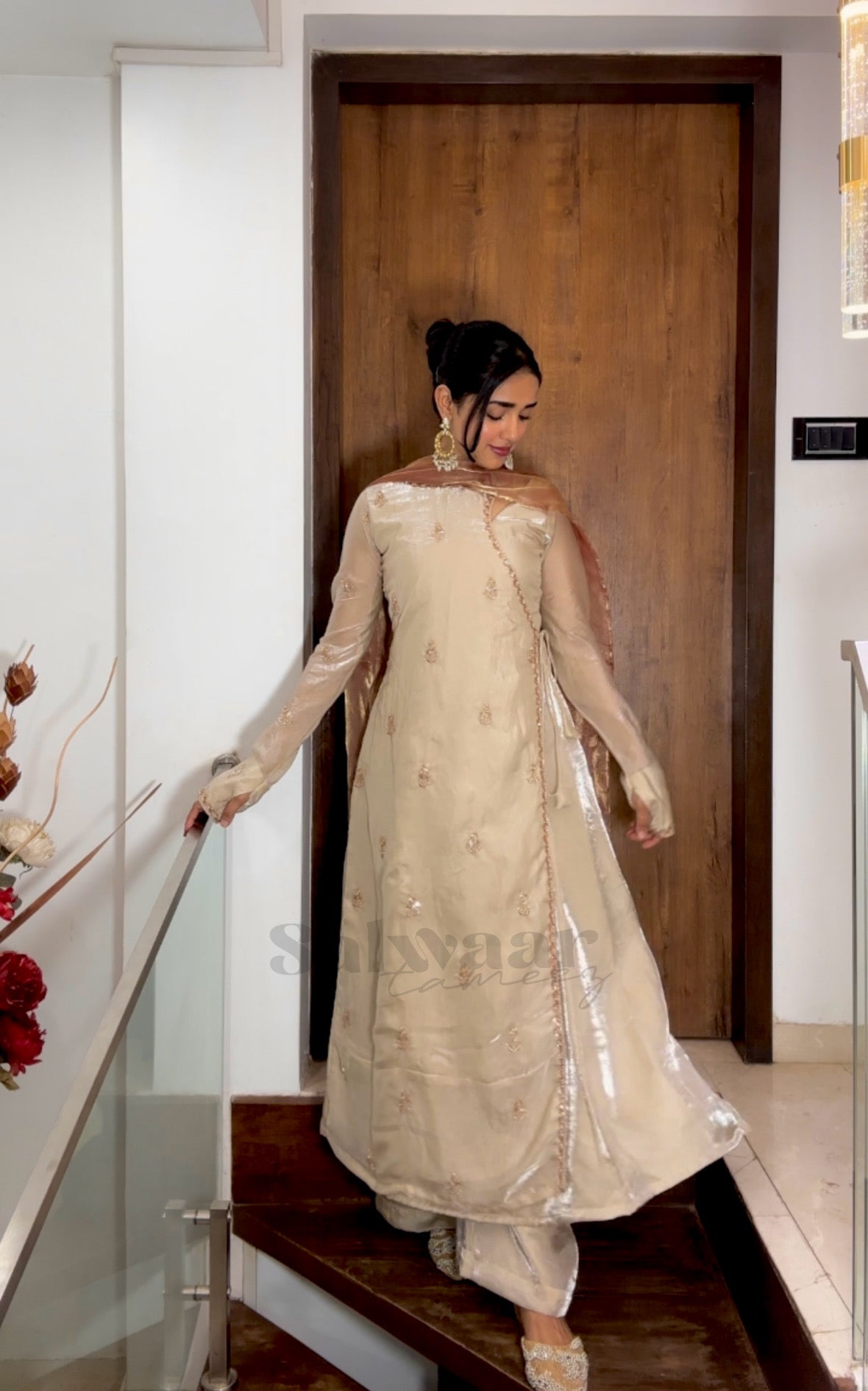 The Chaand Set is a three-piece Anarkali set that comes with a flared Anarkali, bell-bottom pants, and a dupatta. Designed in a rich off-white shade, the outfit features floral and beaded embroidery all over, along with beaded lace detailing.