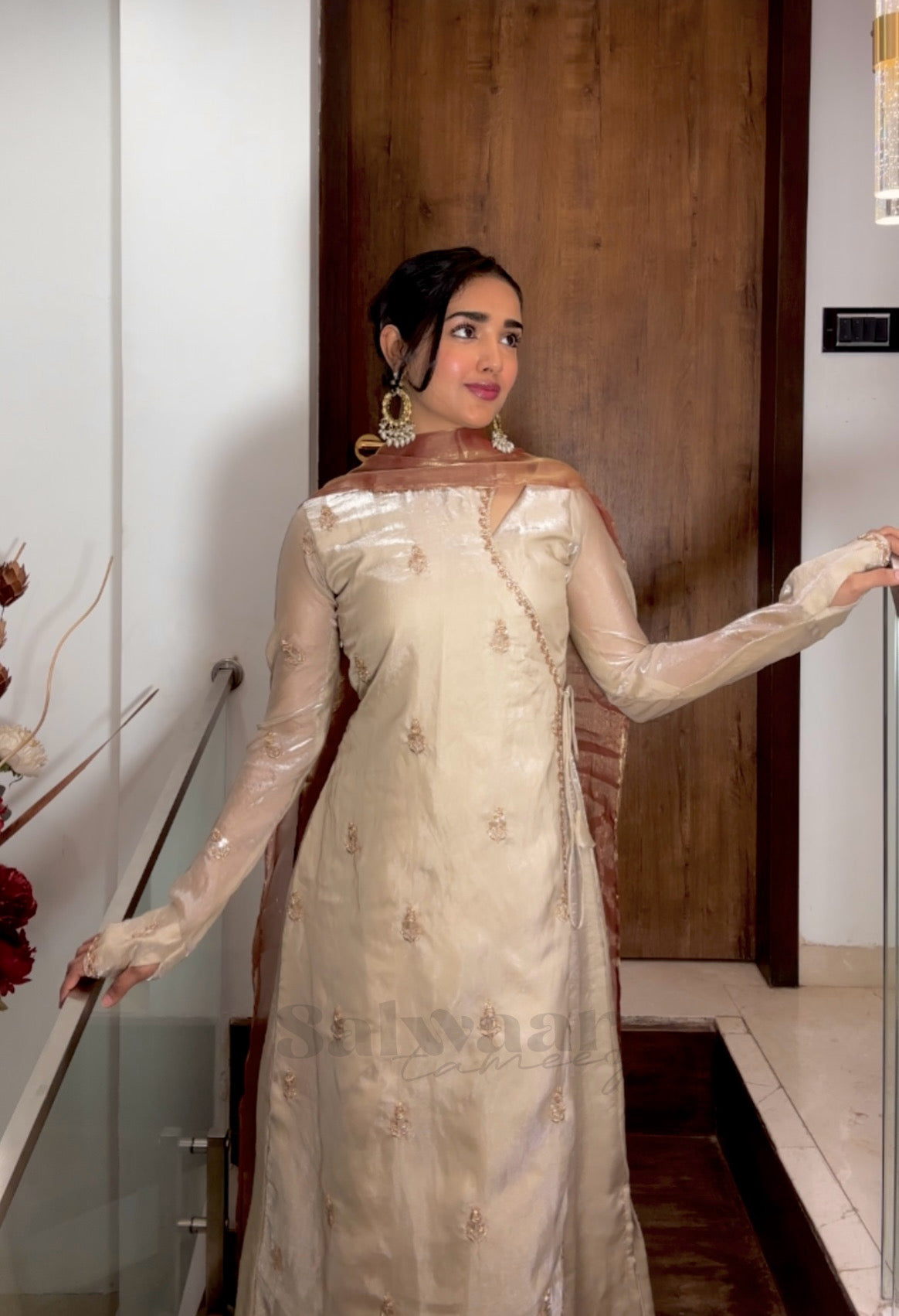 The Anarkali opens in the front and can be tied on the sides for an adjustable fit. It features a beautiful asymmetrical neckline and long sleeves that extend gracefully towards the fingers. The look is completed with matching bell-bottom pants and a dupatta in a beautiful rust tone, adding a subtle contrast to the base. Perfect for festive gatherings and special occasions.