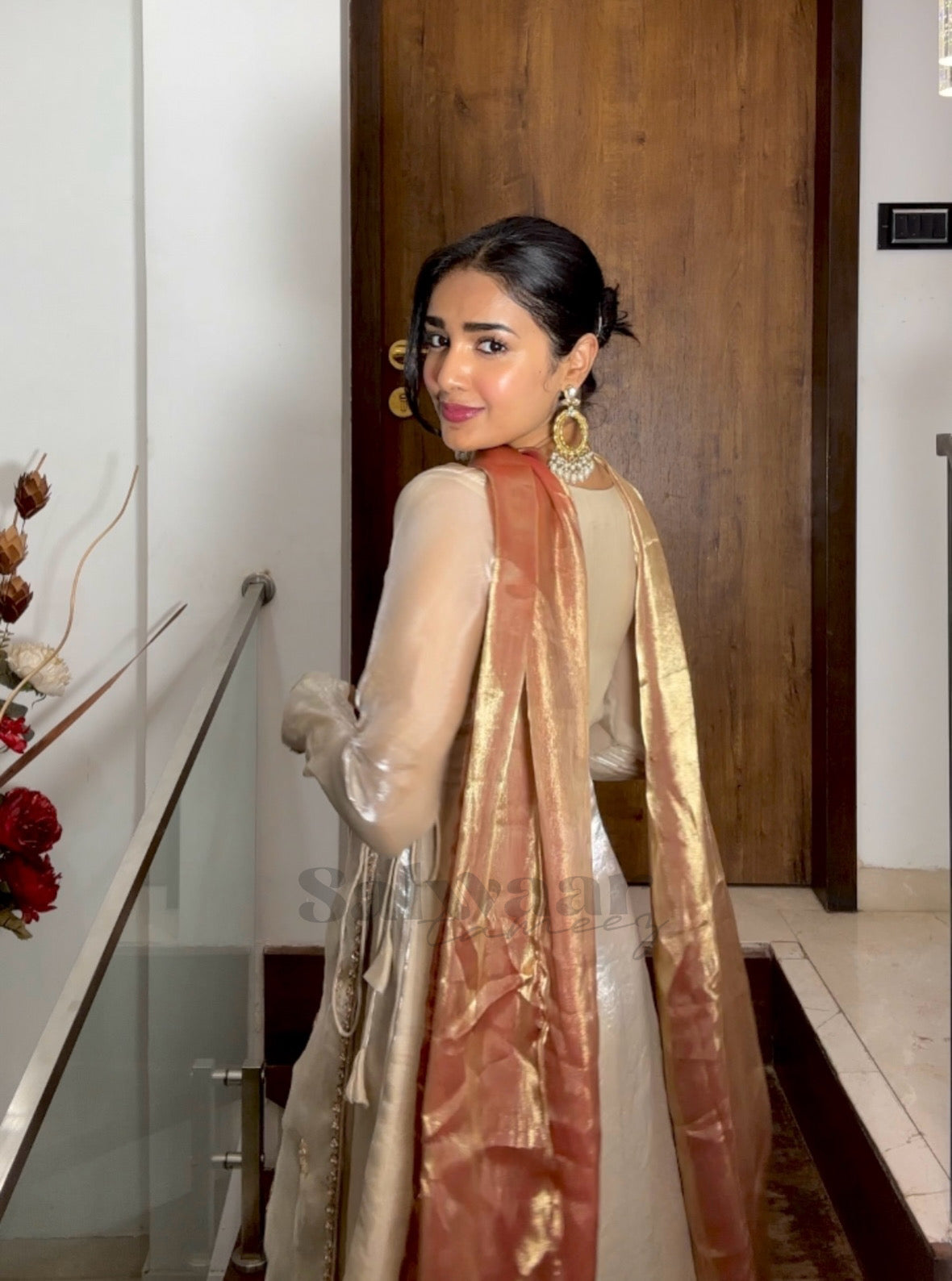 Bell-bottom pants and rust dupatta