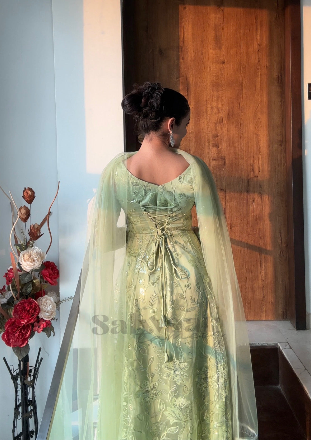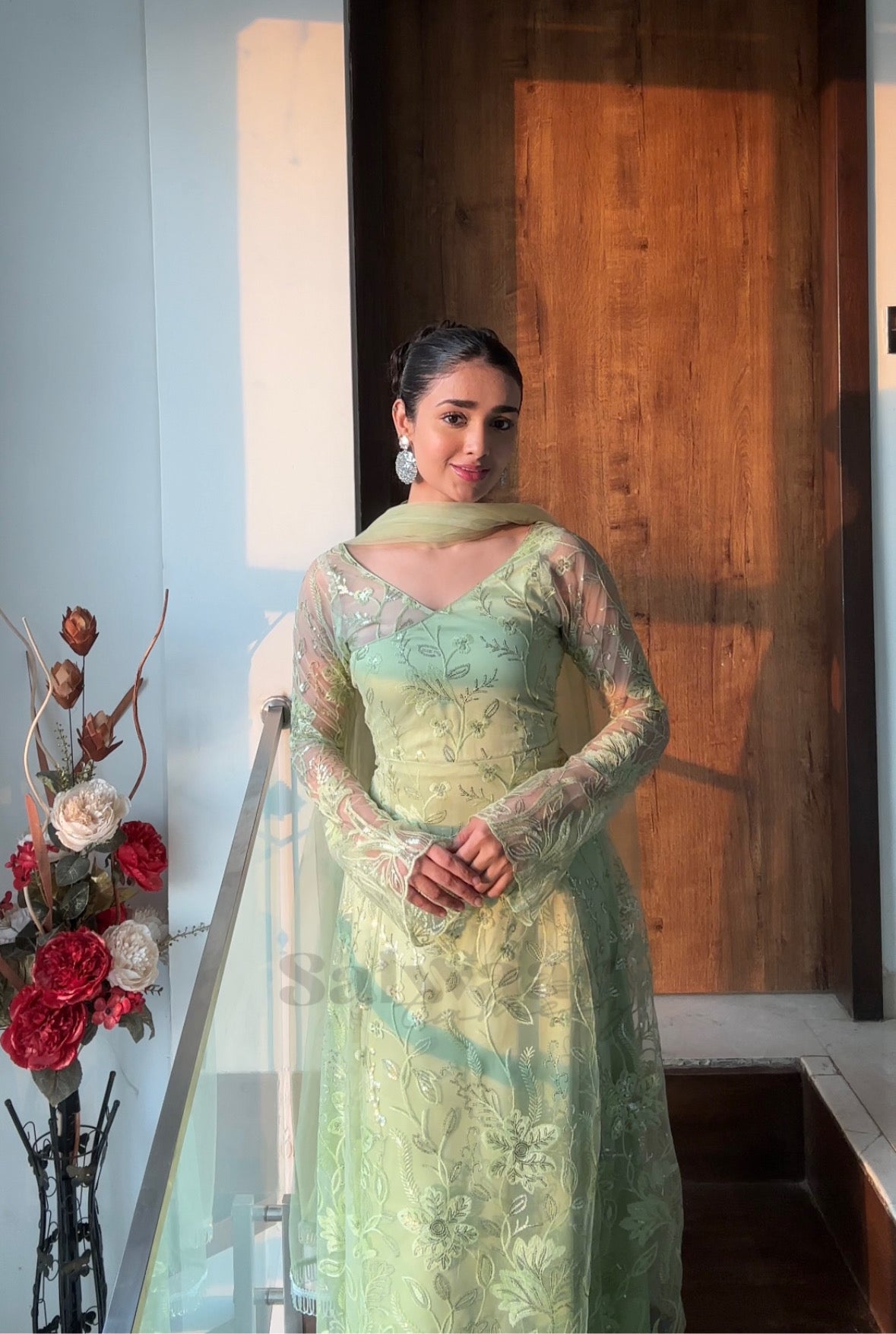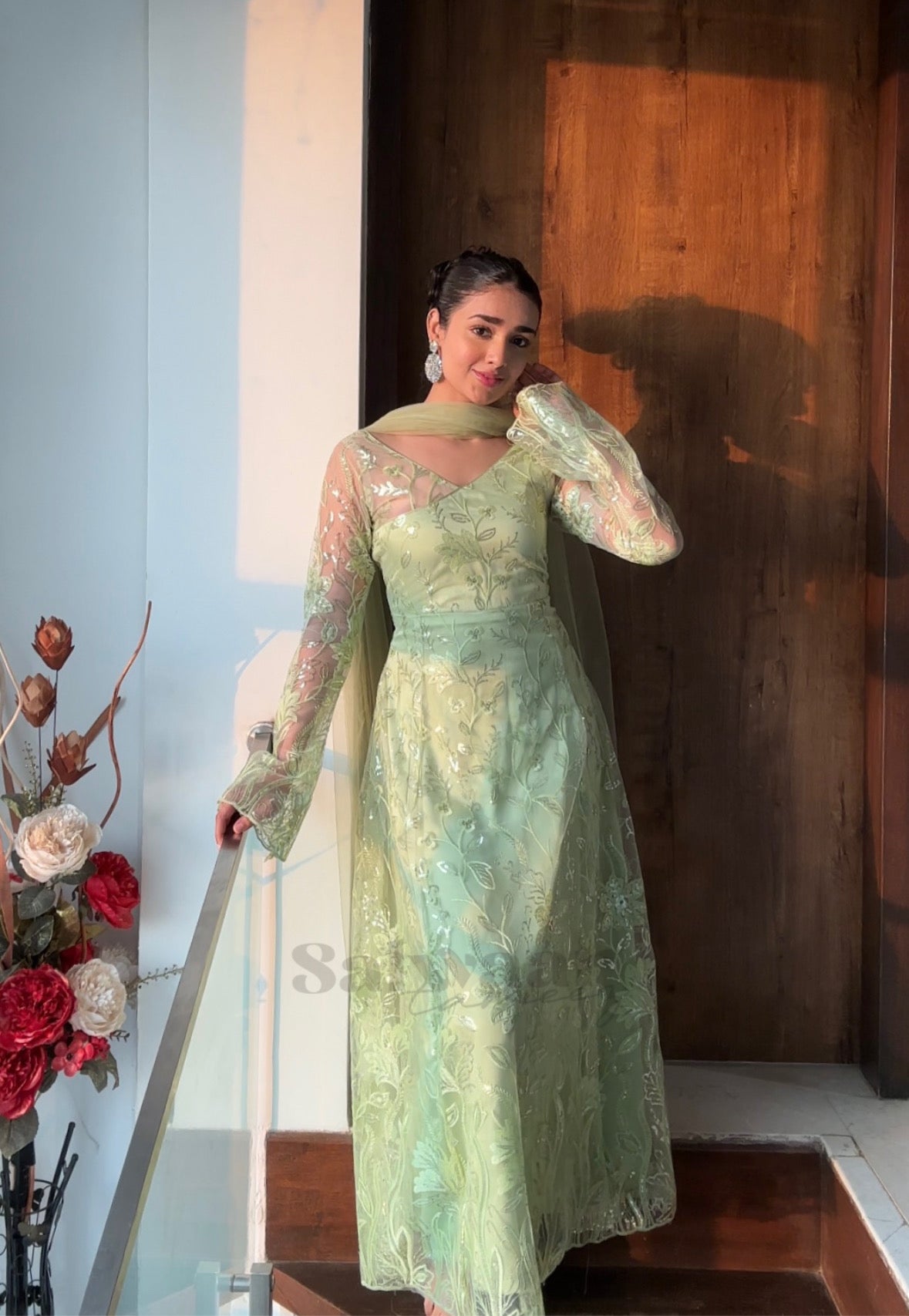 This Anarkali-style outfit is crafted in a lightweight mix of net and satin that falls beautifully on the body. The pastel mint green colour gives it a fresh, delicate vibe, and the subtle sequin work adds just the right amount of sparkle.