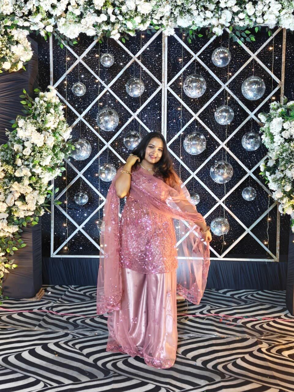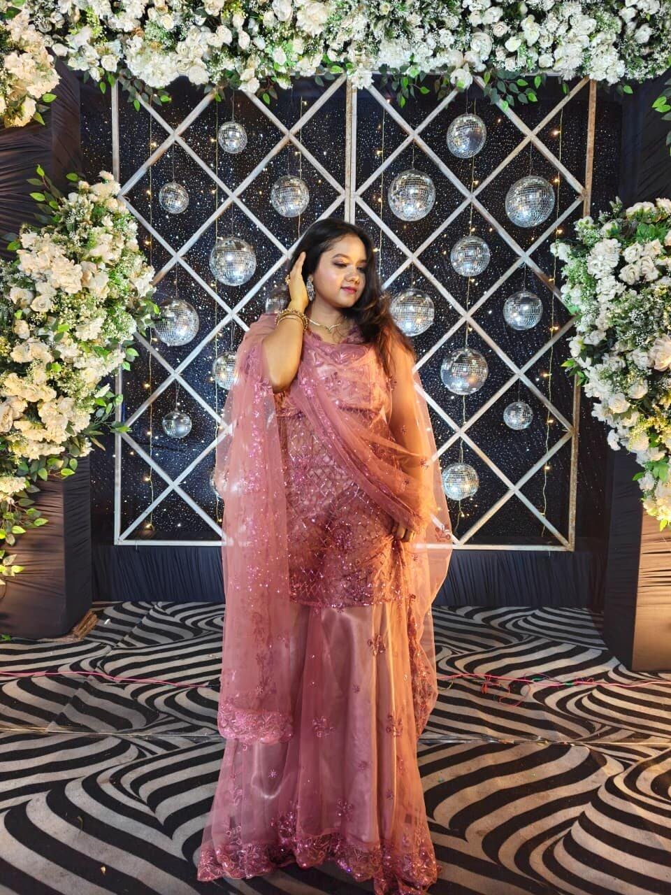 Inspired by the charm of a pink indian outfit and the grace of a pink ethnic dress, this breathtaking set boasts a subtle sharara pink hue in luxurious net and satin. Designed as a versatile sharara for women, it easily transforms into party wear sharara for those glamorous evenings. With intricate sequinned embroidery and a flared silhouette, it appeals to both modern and traditional sharara women seeking a refined yet heavy sharara look.