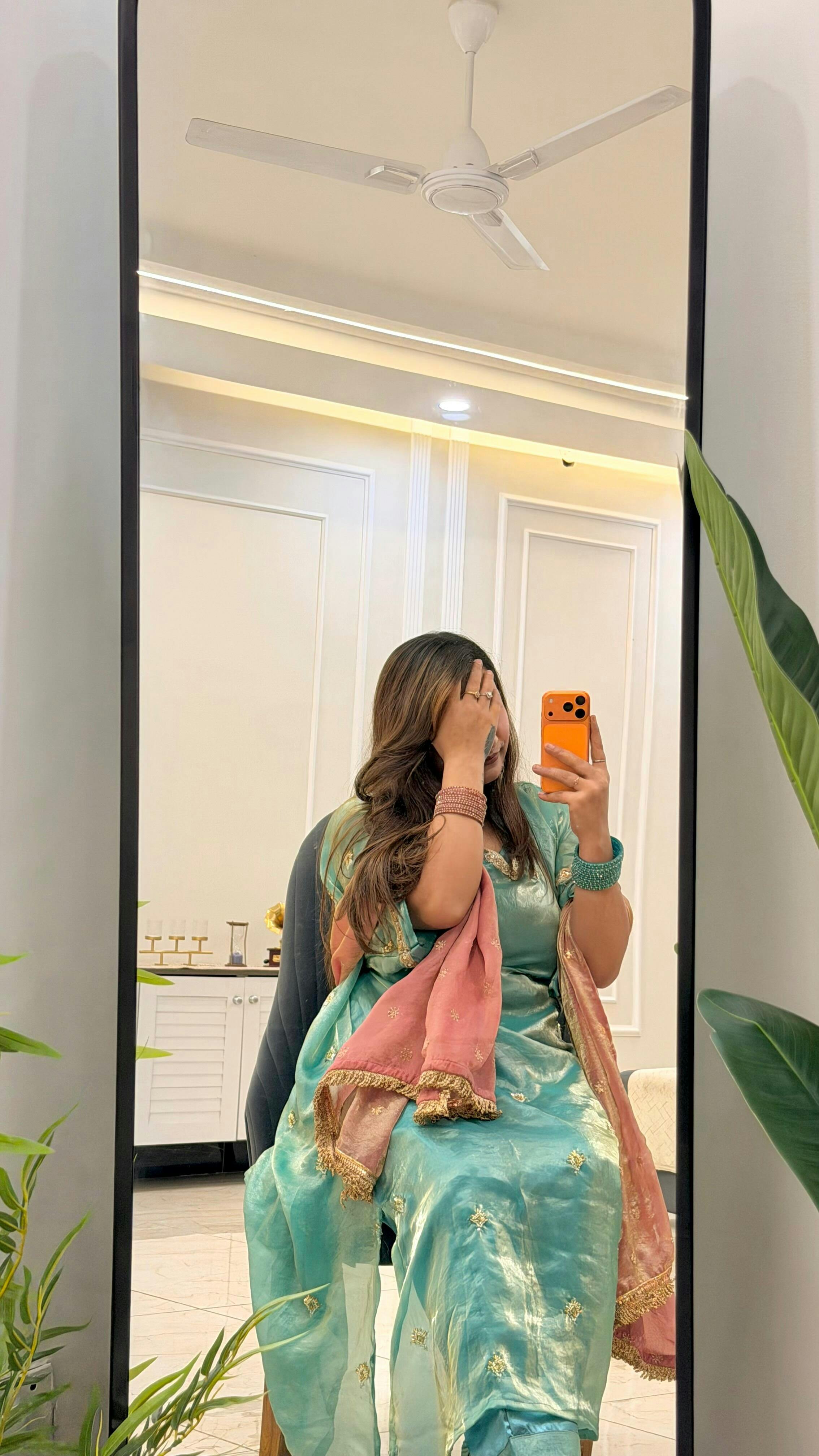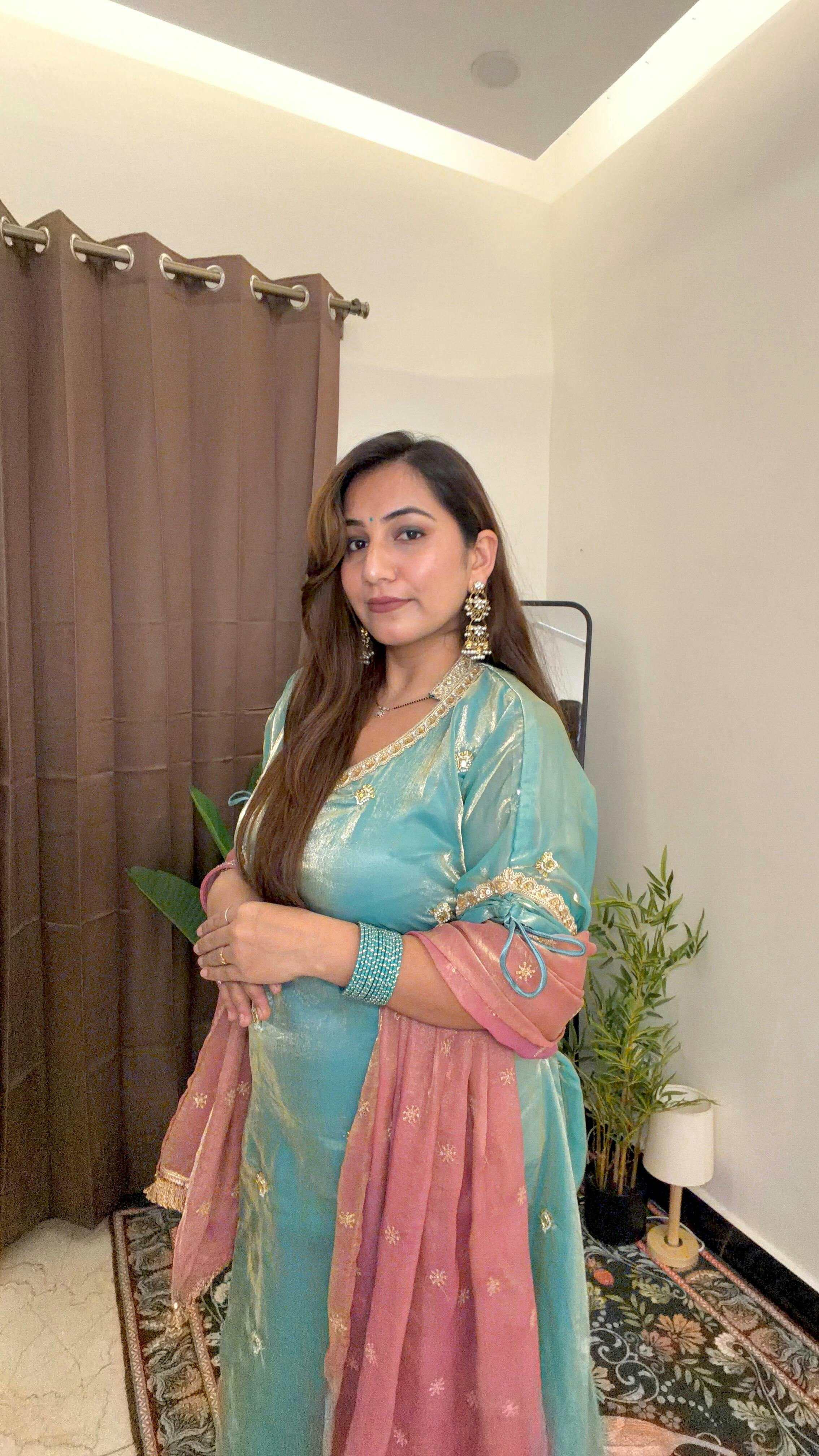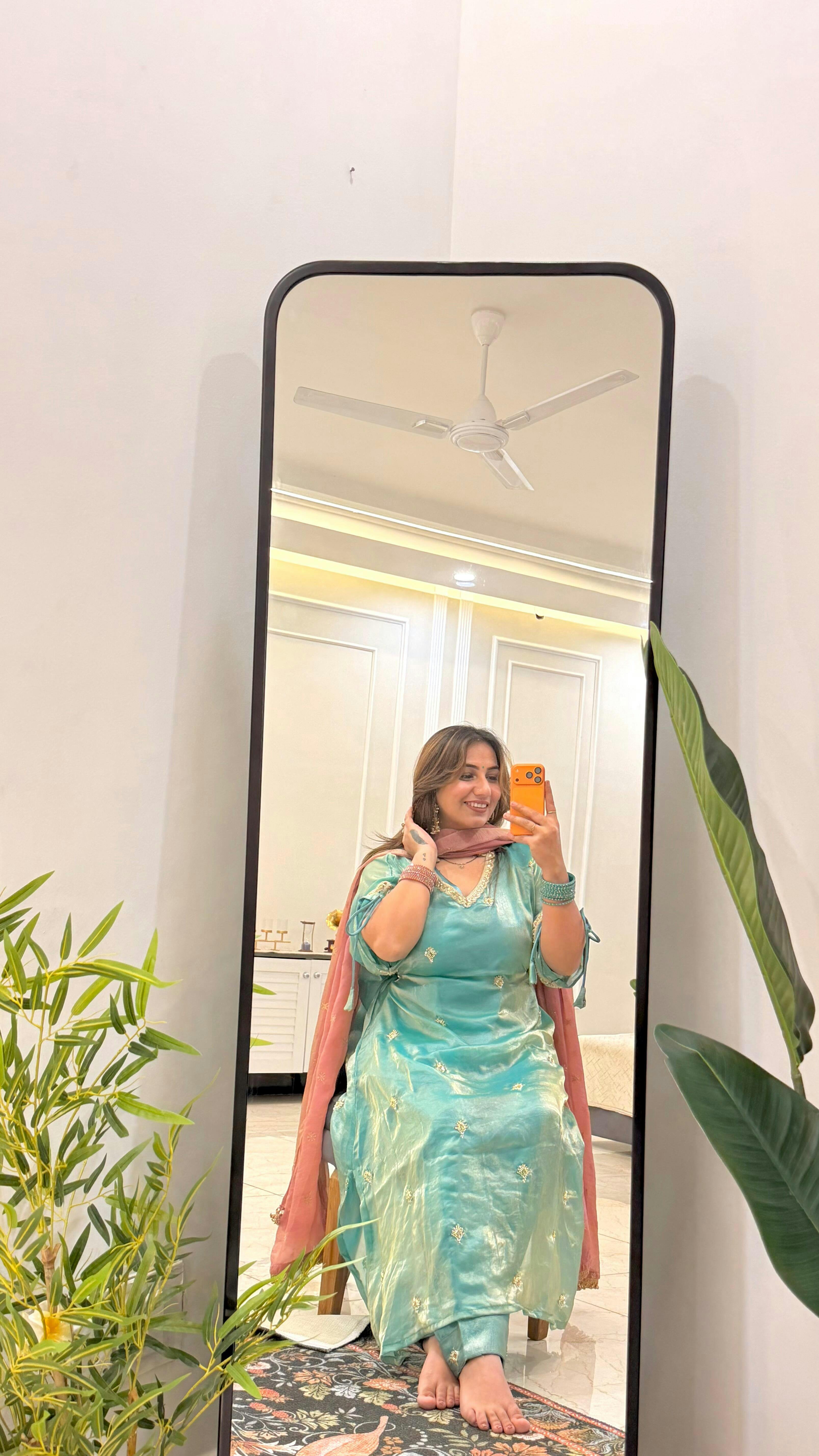 The Mastani Suit Set features a flowy, kaftan-style kurta in a striking Turquoise Blue with a soft shimmer and crimped finish. Designed for comfort and elegance, this three-piece set includes a soft slip, straight pants, and a floor-length kurta that moves beautifully with the body.
