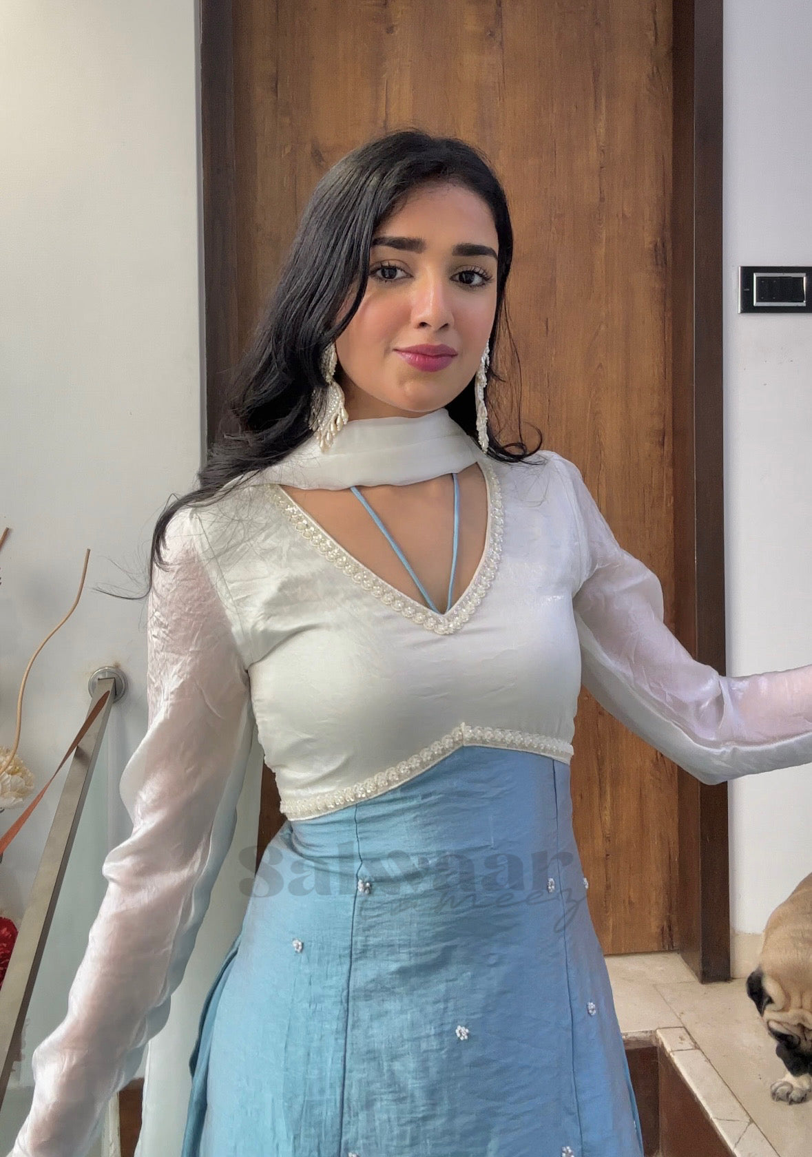 Our Snow White Set is a classic white and ice-blue suit set made in a blend of tissue and satin organza. It has full sleeves with a finger-ring attachment detail, and bead detailing all over for a subtle festive look.
