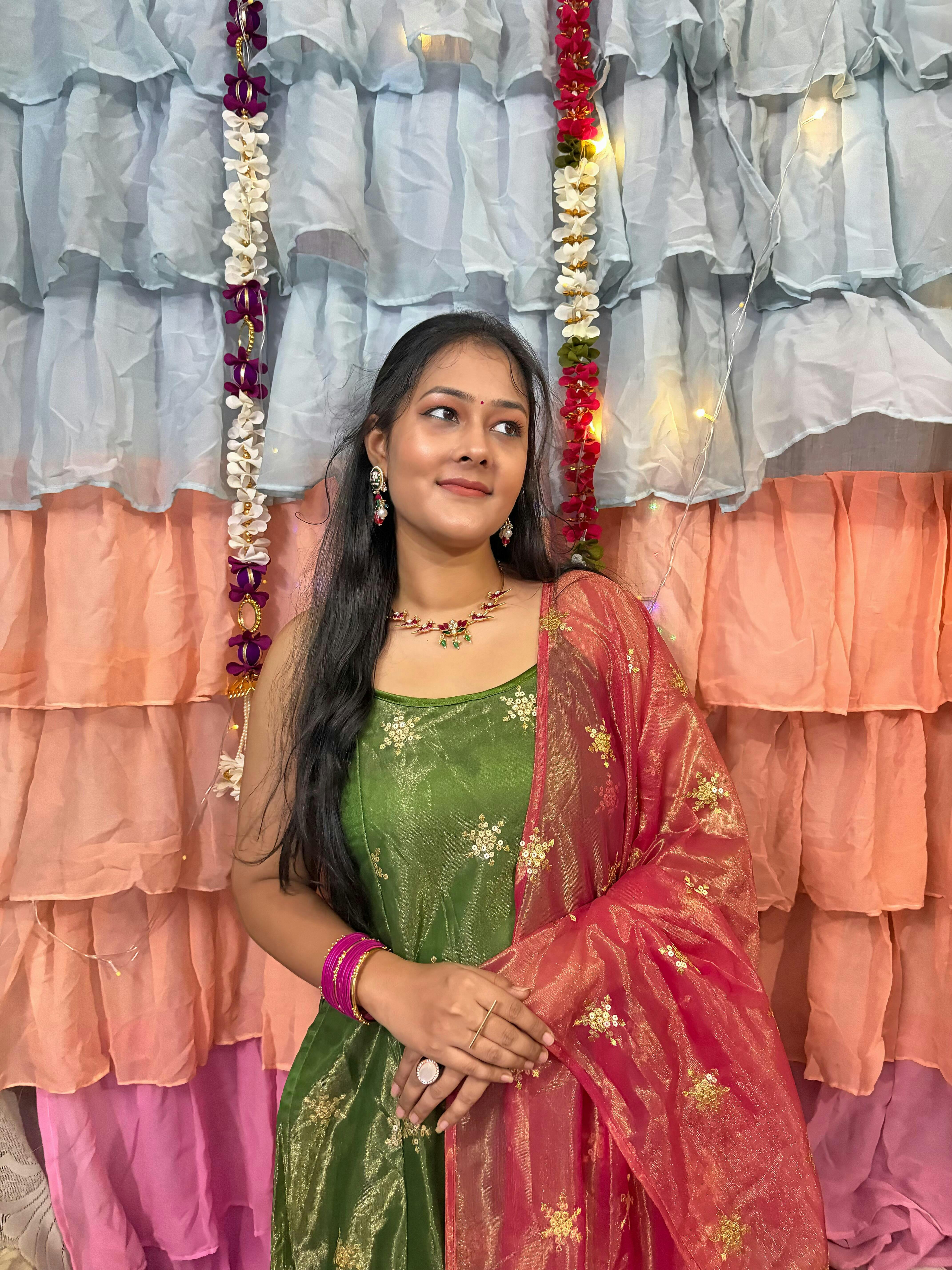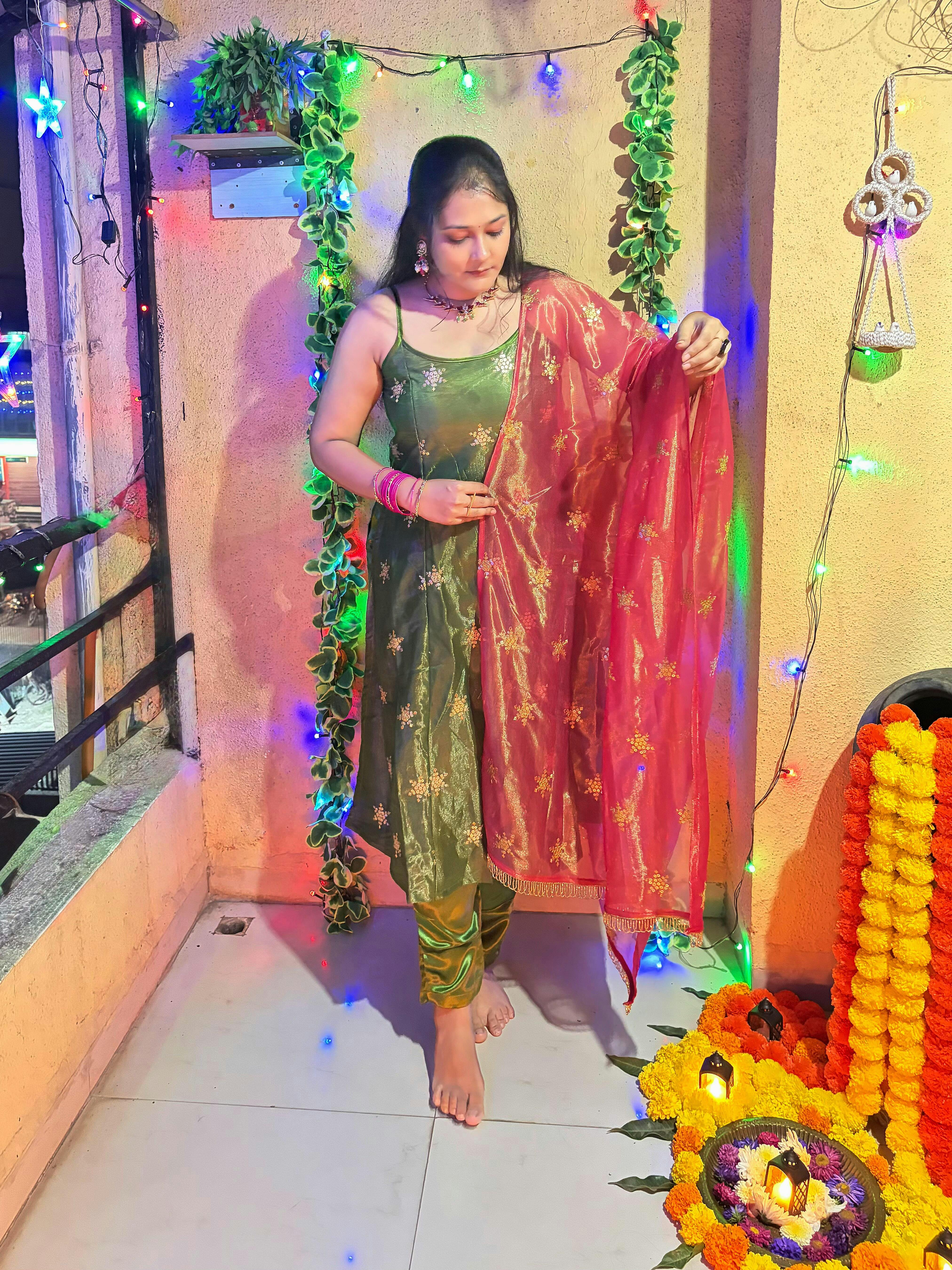 Expertly fashioned in a rich mehendi hue, this ensemble serves as an eye-catching green suit. The thoughtfully placed high slit and the women suit set silhouette ensure that it functions beautifully as a three piece suit, featuring the Anarkali, the shimmery crimson dupatta, and the satin straight pants. Its luxurious zari twill net fabric, complete with embroidery and sparkle, makes this a standout emerald green suit choice for who appreciate a refined look in their wardrobe of designer suits for women.