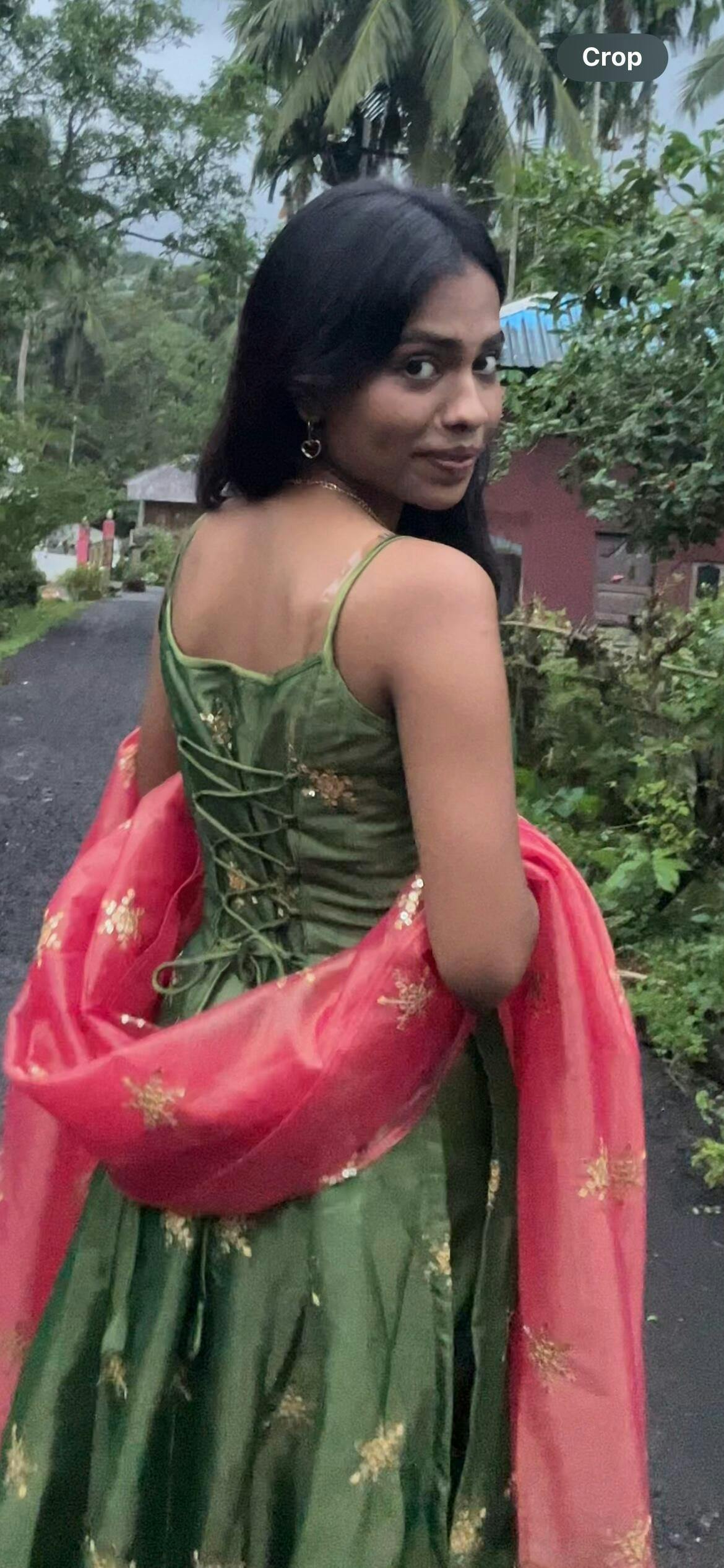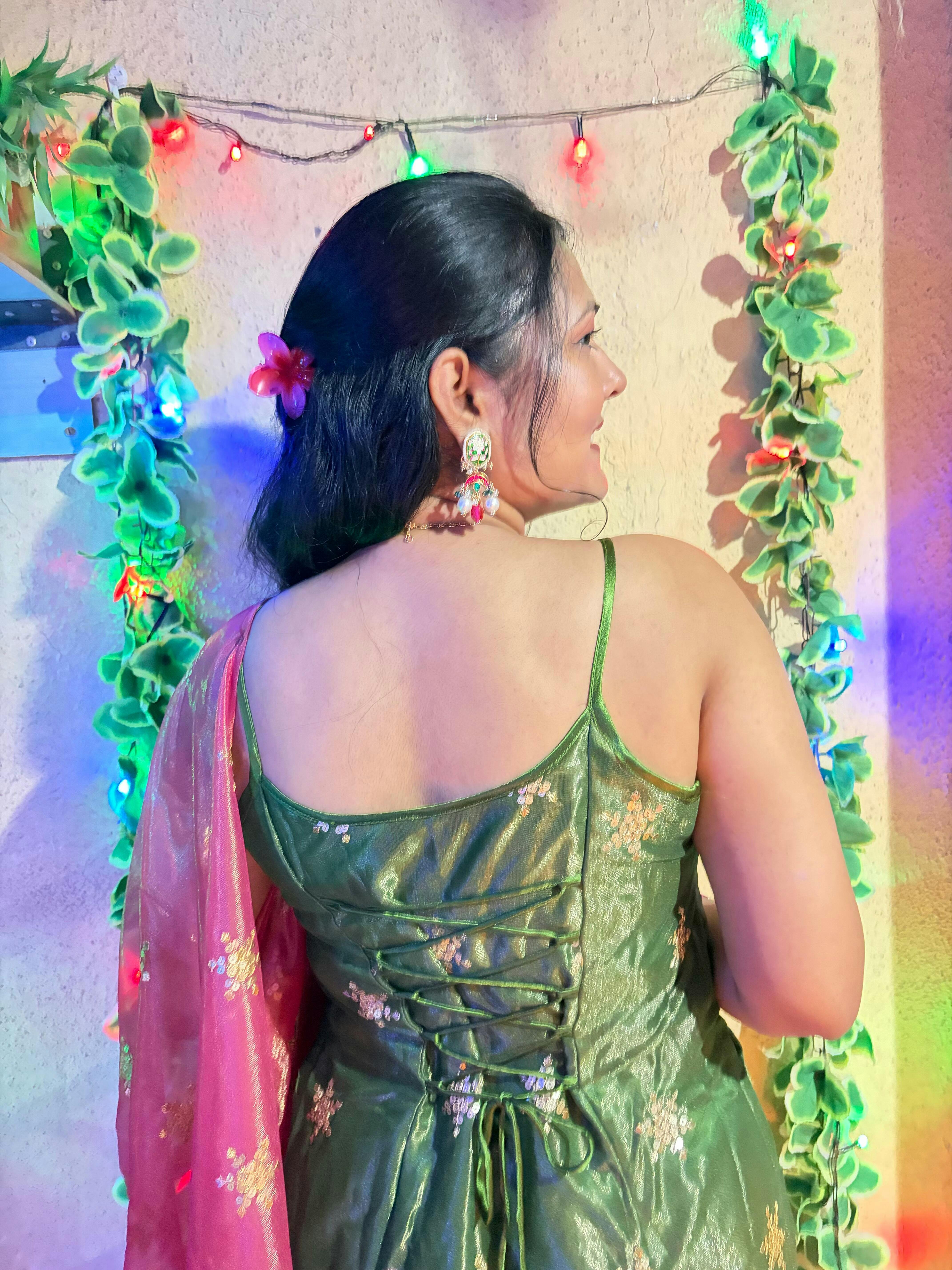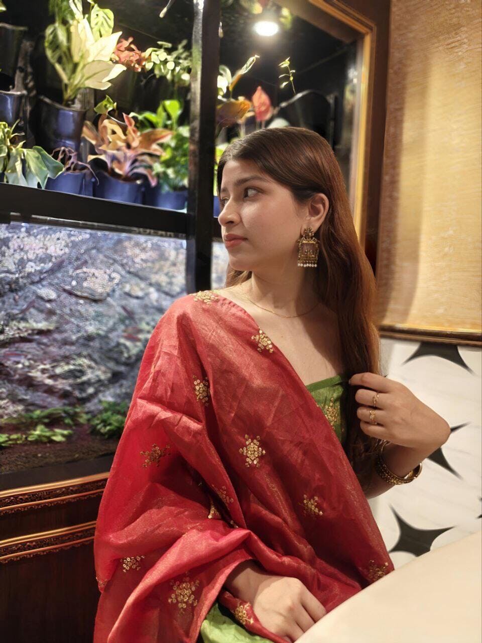 Not only does the mehendi shade echo a light green suit, but the overall design also embodies a thoroughly stylish suit aesthetic. You’ll notice the adjustable strings at the back much like a second-skin fit you’d expect, giving you comfortable customization. It’s an ideal pick for those searching for a green wedding suit, thanks to the stunning contrast of the crimson dupatta. The satin straight pants further enhance the luxurious feel, making it a top-tier satin suit selection.