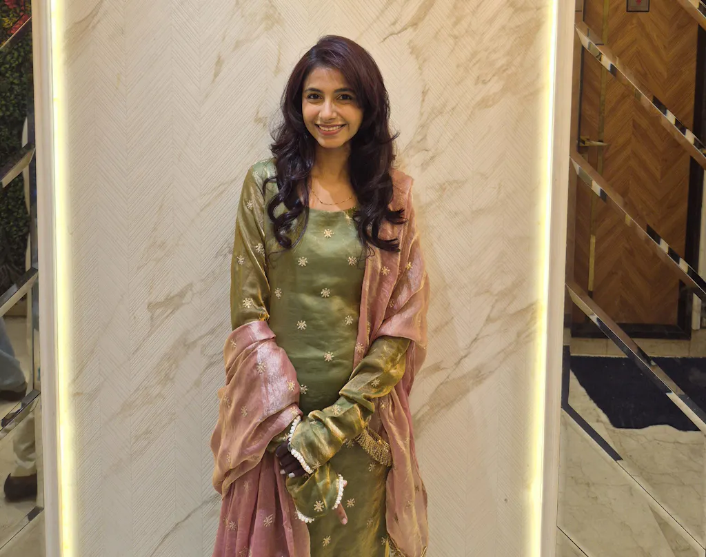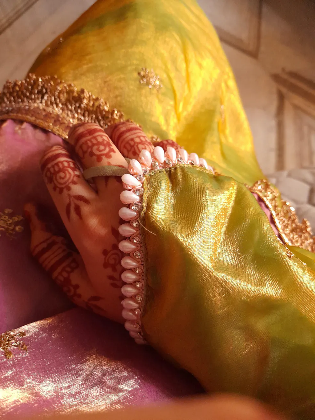 A stunning blend of Pista Green and Blush Pink, the Zaalima Suit Set is designed to turn heads. Made from two-tone tissue silk, the fabric has a soft shimmer that enhances the outfit’s elegance.
